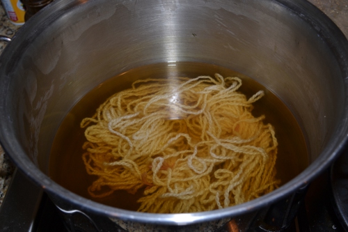 I had an idea a couple of weeks ago to take all the dandelions growing in my yard and use them to dye some yarn. It turned into a three-day project once I finally got going, culminating as I type with the yarn in the dye pot.